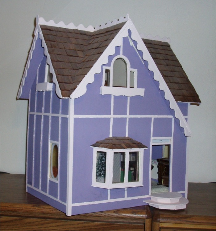 This small four room doll house comes almost completely decorated and furnished - a fresh paint of purple on the outside and beautiful carpet, tile, wall paper and paint on the inside. Accessories and dolls are also available.